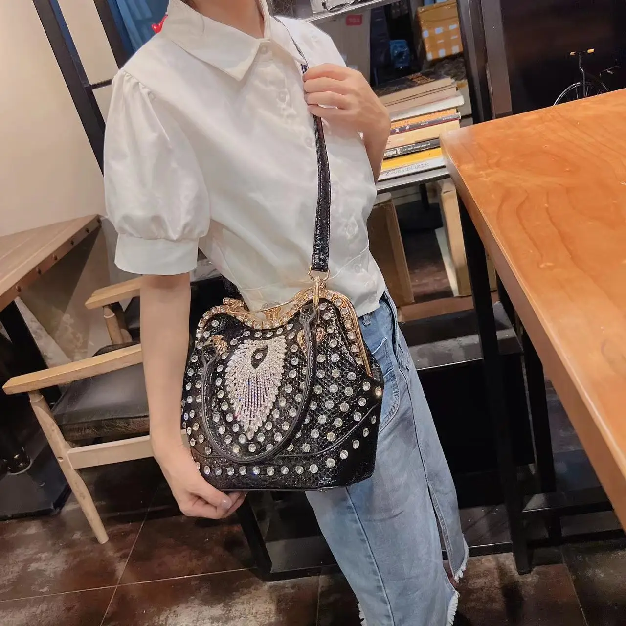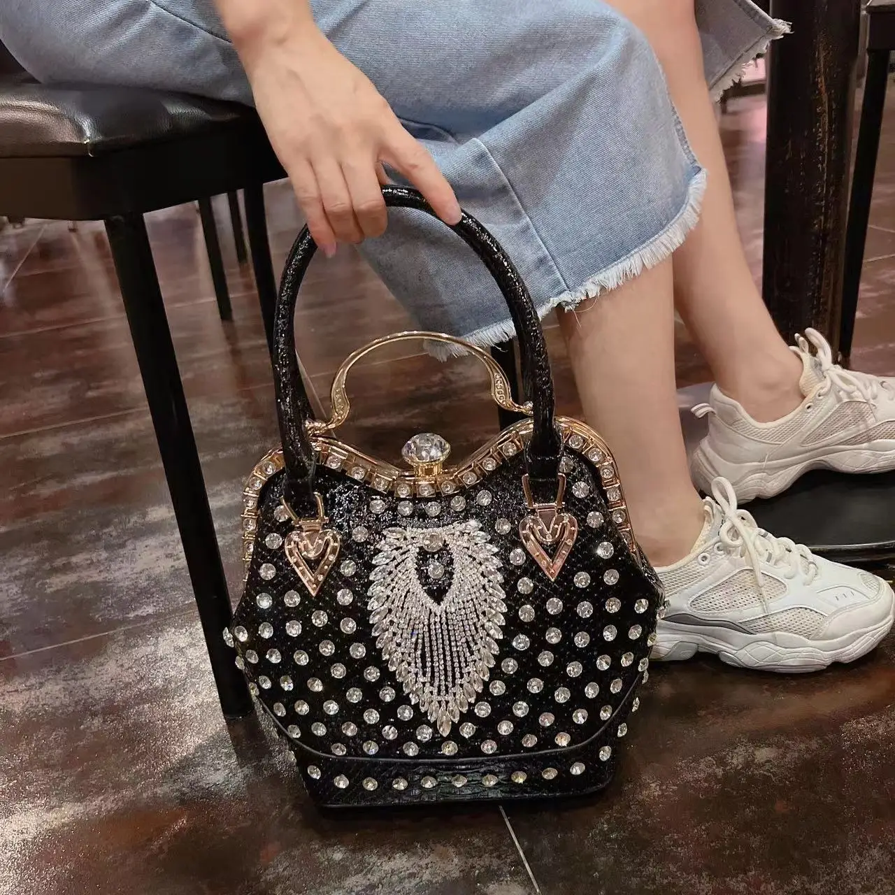 Indulge in timeless sophistication with a luxuriously crafted leather bag adorned with sparkling crystals, adding a touch of elegance to any ensemble